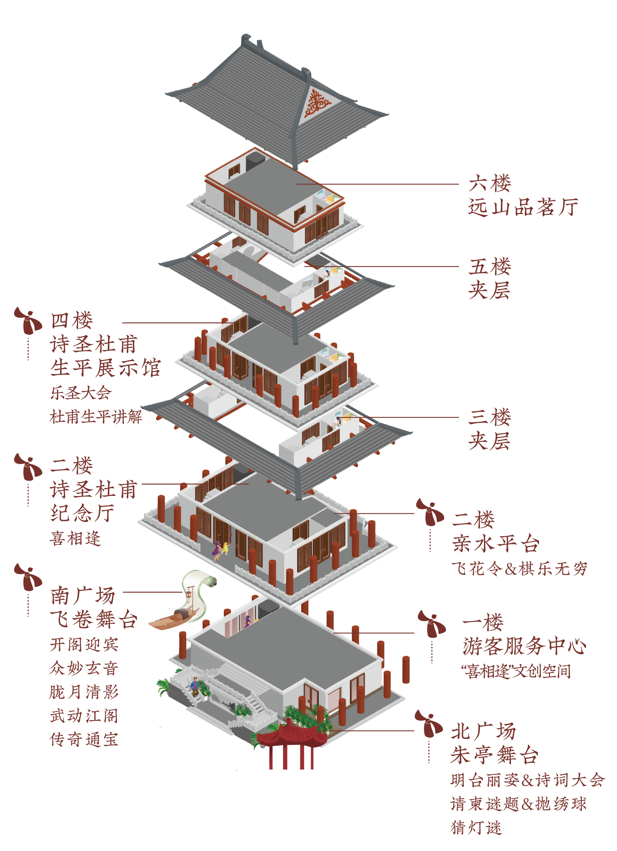 江阁内外,我们精心布局了 8 场主题演艺和 7 场互动游戏,每一层均打造为独立剧情节点,观众可自主选择路线,用“拆盲盒”的形式打开杜甫江阁——