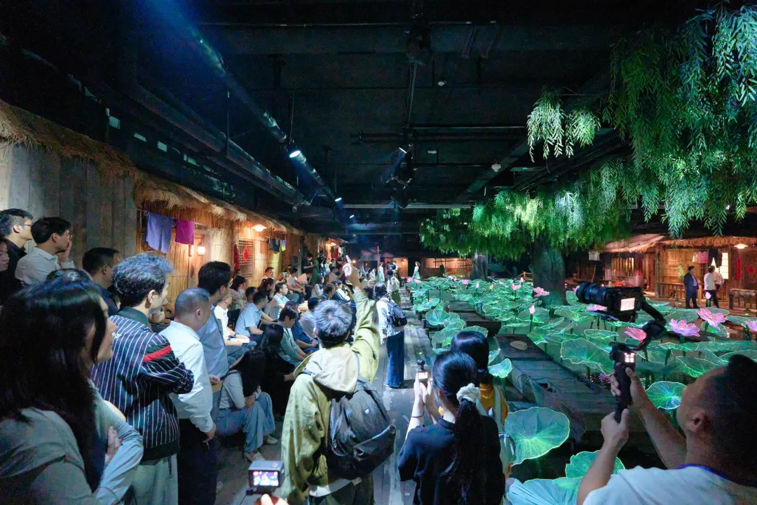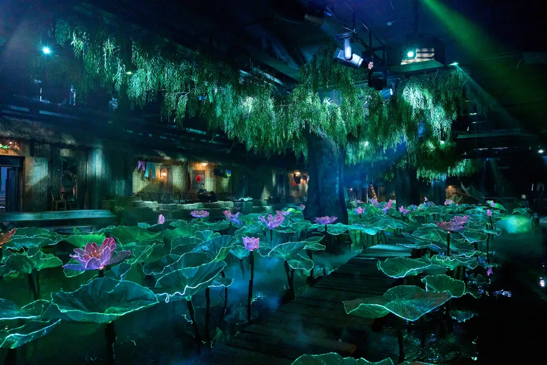 荷花村落,荷景剧场的光影莲池,在静谧中勾勒出 "荷塘月色" 的东方意境;芦苇房剧场还原的渔村生活场景,氤氲着人间烟火的温暖气息;水景剧场的明月倒影、候鸟翔集、江豚跃波、水帘光影,构筑成虚实相生的梦幻水世界;麋鹿剧场的斑斓丛林里,麋鹿与芦苇交织出湿地生态的蓬勃生命力。