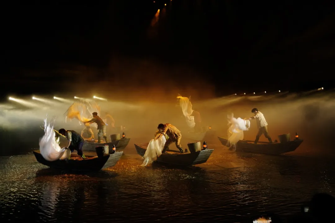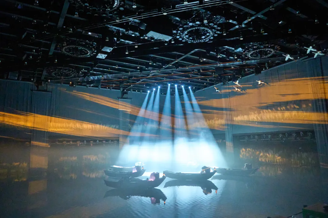 在技术层面,李彦导演团队创新研发数字回旋渔村、潜藏式湖底水景矩阵、多终端可移动数控装置等多项专利和运用技术,构建出270度沉浸投影景深空间。首创移动数控芦苇 、鱼跃式江豚矩阵、光影荷花矩阵等智能动态舞美技术以及智控集成系统,营造“船行莲叶间”的诗意荷塘,再现船载渔民入场到渔女渔夫翩然起舞,以及芦苇苍苍、候鸟翔集、江豚逐浪的生态奇观。明和集团提供全流程技术落地服务。