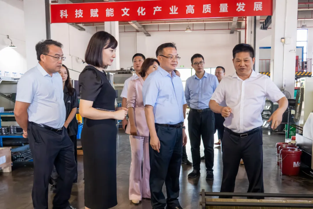 在明和集团董事长傅高武的陪同下,调研组一行听取了企业关于经营发展、产业链布局、研发创新及外贸业务的汇报,全面了解企业在文化装备领域的发展态势。