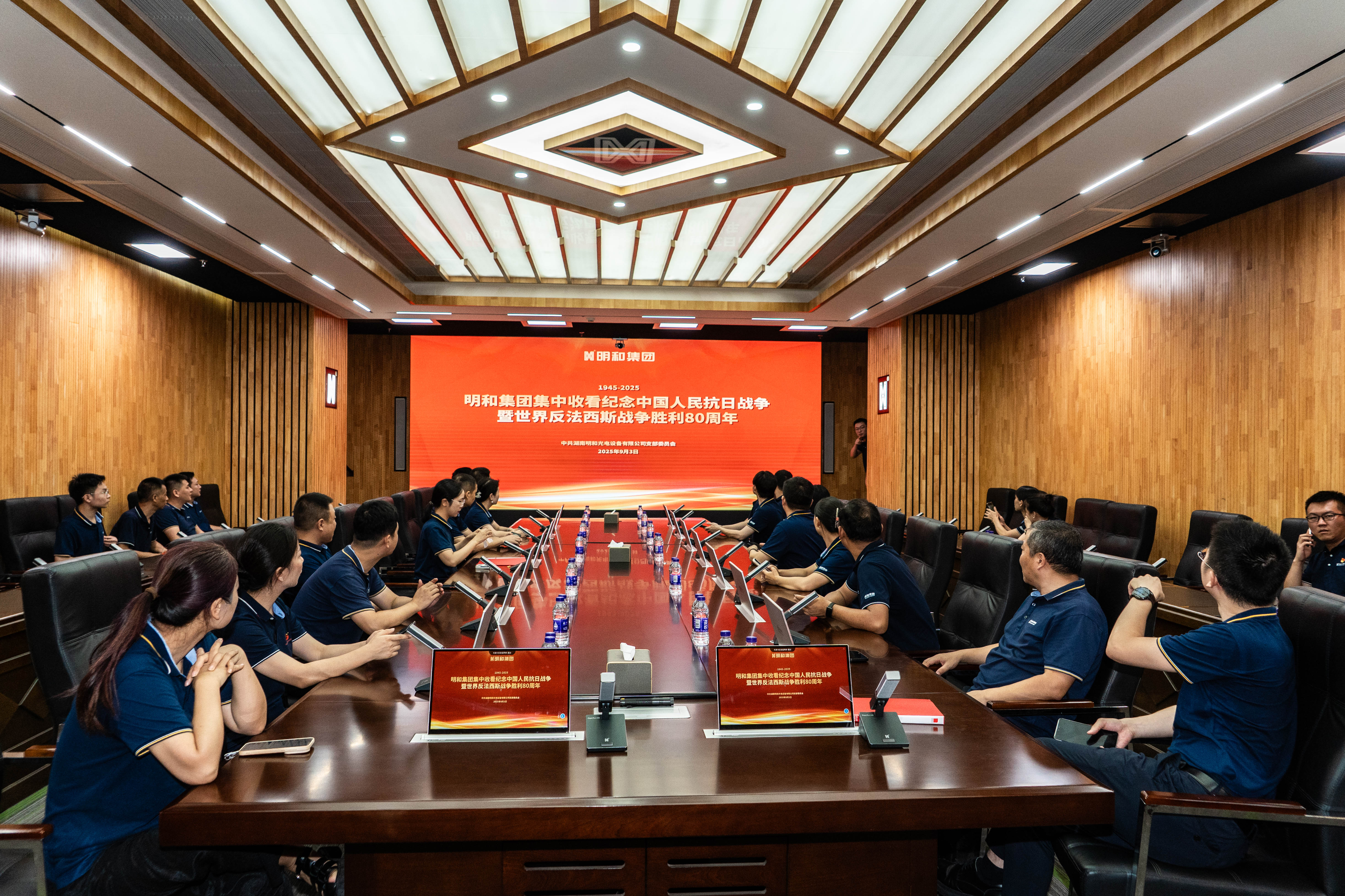 继升旗仪式后,公司党员干部及部分职工代表在明和智能化会议室观看中国人民抗日战争暨世界反法西斯战争胜利80周年阅兵仪式直播。
