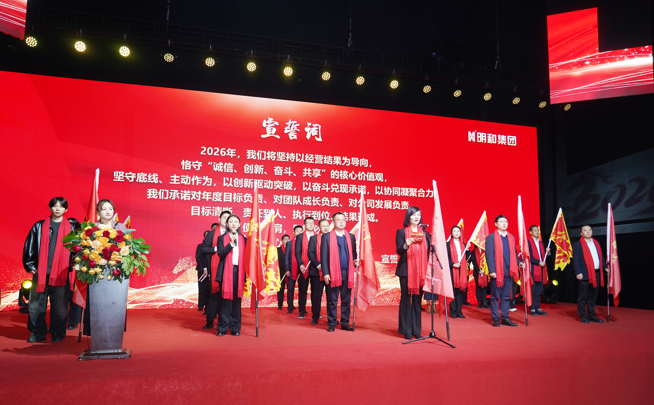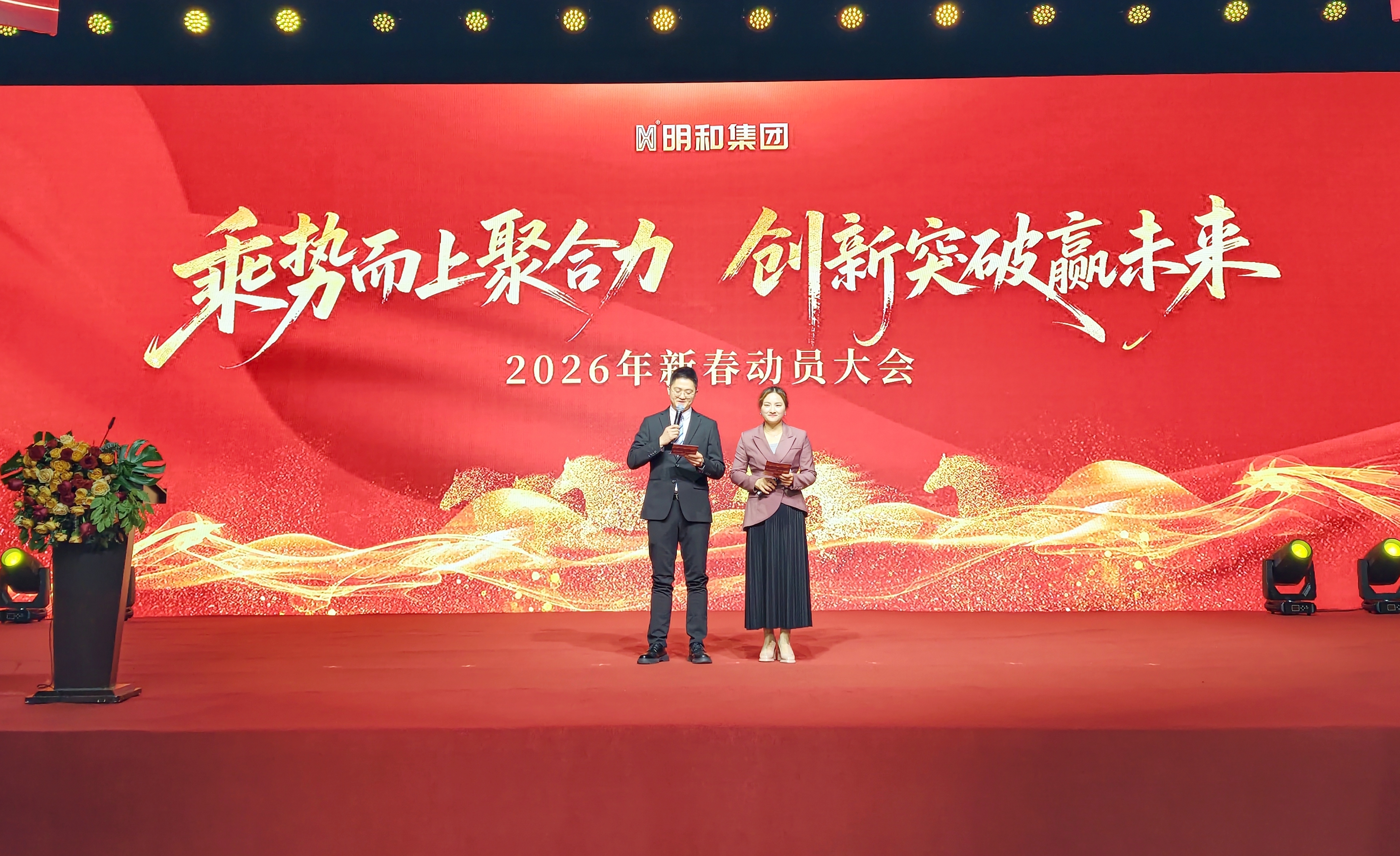 上午9时8分,明和集团“乘势而上聚合力 创新突破赢未来”2026年新春动员大会正式启幕。