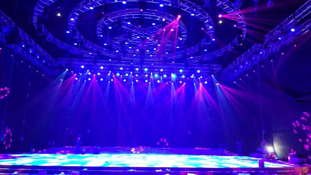 舞台中央从中间向四周均匀分布一套五角星桁架、两套环形桁架、一对弧形桁架,舞台后区设三道直桁架、两根立架,舞台两侧各设两道直桁架,在观众区上空设多道直桁架和45°角接桁架。