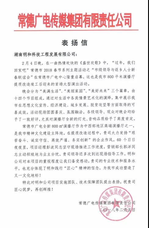 效率上争分夺秒,品质更是不惧考验!工程竣工后,演播厅首次试演便担纲重任。由中共常德市委,常德市人民政府主办的2018春节系列主题活动《过年,我们回家吧 常德市春晚》、《常德市新年新诗音乐会》、《常德市少儿春晚》……连续多场市级重量级晚会活动在此录制,焕然一新的演播厅绽放荧屏,以其先进的系统设计和一流的技术水准,为观众带来了颠覆性的收视体验!