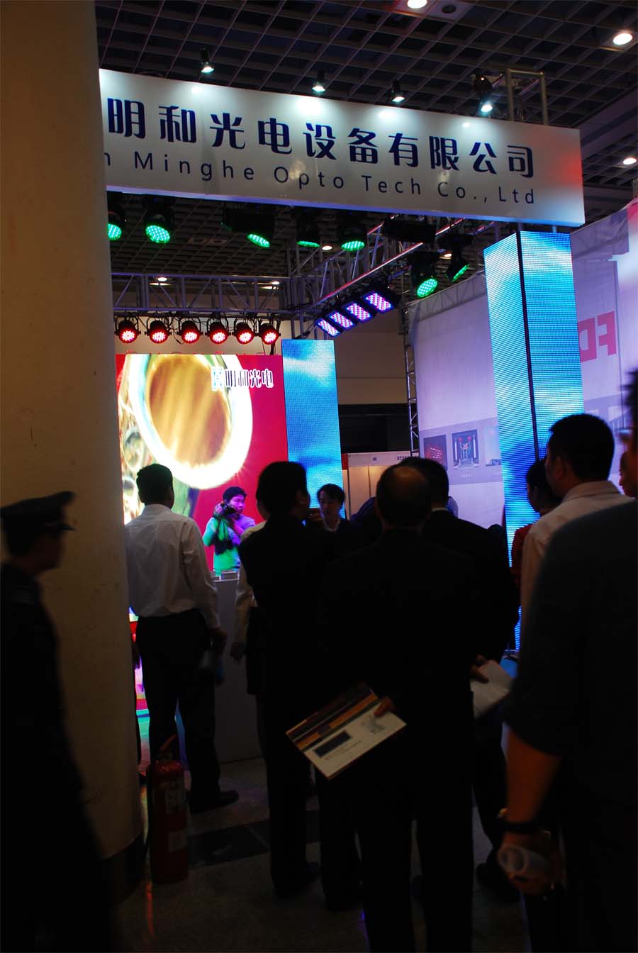 4月25日-26日,一年一度的演出行业盛会“中国(济南)演艺装备场所设施展览会”在山东济南舜耕国际会展中心举隆重举行,我公司携多款LED屏、LED灯具及电脑摇头灯登台亮相,博得众多观展人员的关注。包围着展台四周立柱的P16彩幕实时播放动感炫目的素材,将展台打造得十分靓丽、灵动。展台正中央的高清P5户内全彩三合一显示屏色彩绚丽、画质出众,引得多位参展商驻足观看,备受关注的还有吊装在展架上的高清P4户内全彩三合一显示屏,其轻便的箱体结构和高清的画质赢得多位客户的青睐。M-L162T1RGB、M-L270TIRGB、M-LW324RGB等多款LED灯具交相辉映,富于变化的灯光效果将整个空间打造得绚丽缤纷, 吸引了多位参展商前来洽谈。