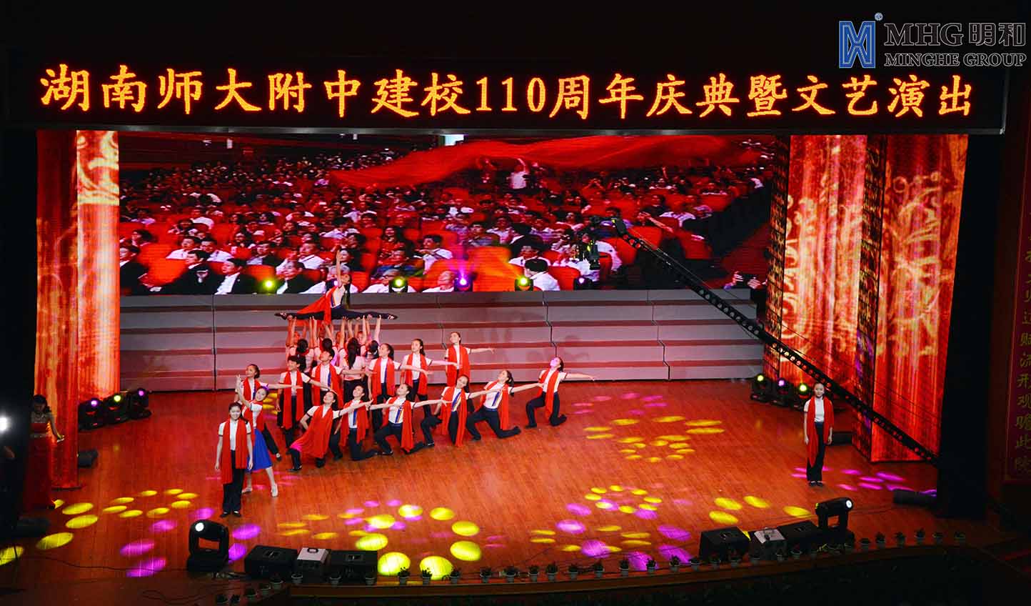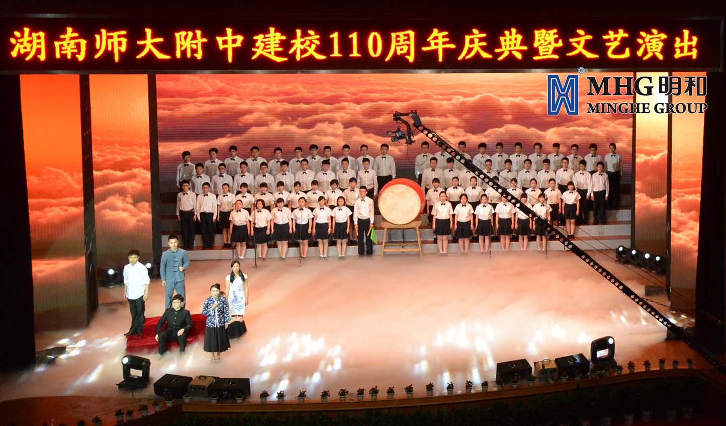 百有十年,木铎声振。 2015年5月2日,湖南百年名校师大附中校园里人潮涌动,来自世界各地的附中学子齐回到母校参加110周年华诞庆典。应用地球物理学家、中国工程院院士何继善,著名电视节目制片人、《爸爸去哪儿》总导演谢涤葵,知名主持人李维嘉等杰出校友欢聚一堂,共同“致青春”。明和集团凭借强大的舞美综合实力,为本次校庆提供了先进的声光电系统集成技术以及过硬的舞美工程服务,为校庆的成功举办倾情助力。