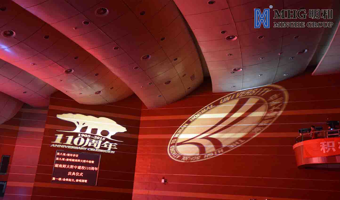 湖南师大附中的校徽及本次校庆的logo通过明和集团旗下的电脑摇头灯映射到舞台四周,营造出大气、统一的效果。