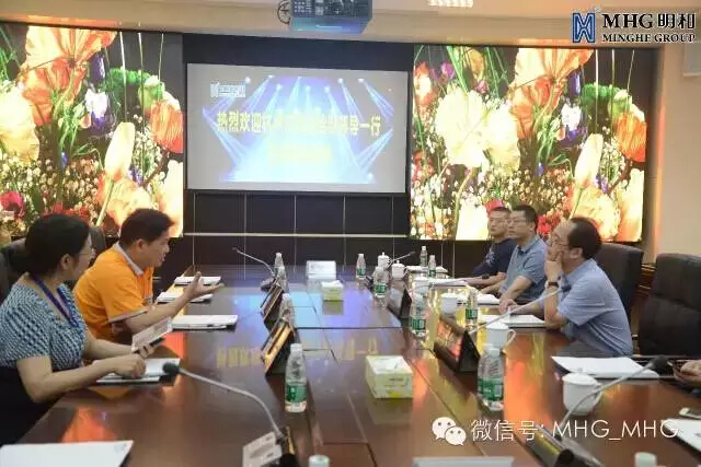 参观完毕,考察组一行前往明和多集团媒体会议室召开调研座谈会。明和集团傅高武董事长向考察组一行汇报了明和集团近年来的经营状况及项目进展,并现场为考察组一行演示了由明和集团设计并施工的智能化多媒体会议系统。智能化多媒体会议系统作为明和集团工程系统集成解决方案的全方位体现,集成了目前最先进的多媒体系统设备,偌大一个会议室中的高清显示系统、多模式扩声系统、灯光系统、智能控制系统等八大子系统,均可由技术人员手中一个小小的平板电脑进行无线控制,轻而易举实现了多种模式的会议场景切换需求,得到了考察组成员的称赞。