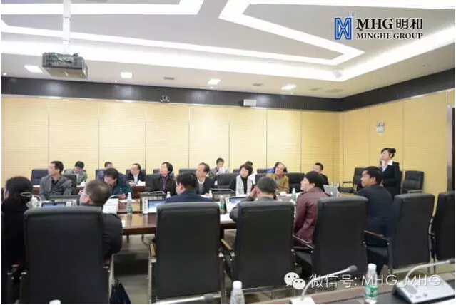 ▲ 在明和多媒体会议室内,傅高武董事长向考察组一行汇报集团近年来的所取得的成绩及经营状况。