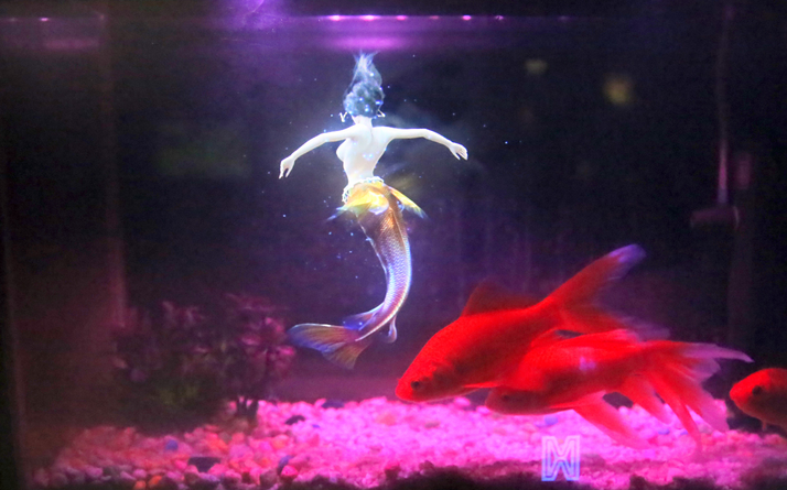 (由3D成像技术呈现的美人鱼正和几条观赏鱼在“嬉戏”。)