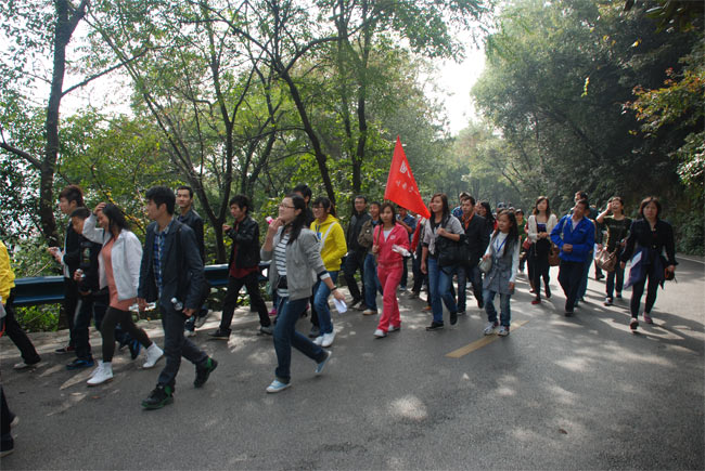 在山顶娱乐结束后,大家向岳麓山的南大门进发了。一路上,大家一边唱着山歌,一边欣赏麓山的胜景。在下山的途中,大家意兴阑珊地参观了观光长廊、隋舍利塔、爱晚亭、岳麓书院、鸟语林等著名景点。从山顶到山下的途中,洒满了一路的欢声与笑语。
