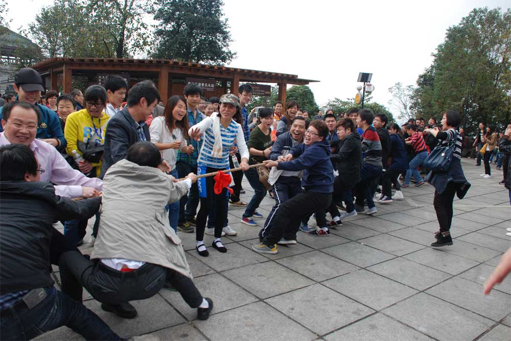 在山顶的空地上,大家簇拥在明和旗帜的周围,吸引了所有游客的关注。而最引人注目的便是他们的休闲活动——拔河了。一个个生龙活虎的队员、一声声激昂澎湃的呐喊声将所有游客的情绪推向了高潮。满脸通红、全力以赴者有之;捋起衣袖、蓄势待发者有之;欢欣鼓舞、摇旗呐喊者有之。更令人振奋的是,其他游客的情绪也被明和光电的员工点燃,他们纷纷加入了拔河比赛的行列。在明和员工及其他游客的强烈要求下、拔河比赛增加了女子组、儿童组、挑战赛等场次,引得游客们的积极参与。游客们对明和光电乐于与大家分享快乐的大度与豁达表示赞赏。令人称奇的是,不少游客知道我们便是来自在科教会“大放异彩”并被媒体广为报道的明和光电。