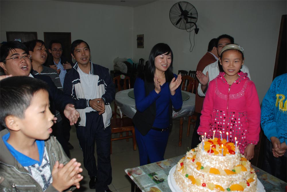 到达山下,大家来到了公司细心安排的饭店。随着“生日快乐”歌的响起,跳动的音符牵引着大家内心的情愫融合在了一起。各位寿星及其亲友情不自禁地唱起了生日快乐歌,让现场的每个人都感觉到了幸福与温馨。大家将生日蛋糕上的蜡烛点燃,小朋友和领导们一起将蛋糕分给大家、也是将祝福与欢乐分享给大家。随后,公司的领导和员工代表发表了他们真挚而热情的讲话。员工代表叶建波代表如是说:“感谢傅总,感谢公司对我们的关心。我觉得今天真的搞得蛮好的,我和我的女儿都很高兴、挺感动的,也祝大家生日快乐,谢谢大家、谢谢明和!”接下来销售部的蔡文辉用一段别开生面的“钢管舞”表演引得大家笑得“人仰马翻”;仓储部的陈小建则用一首感情充沛的“妹妹来看我”将气氛推到顶点。全场,大家都沉浸在幸福与快乐海洋中。