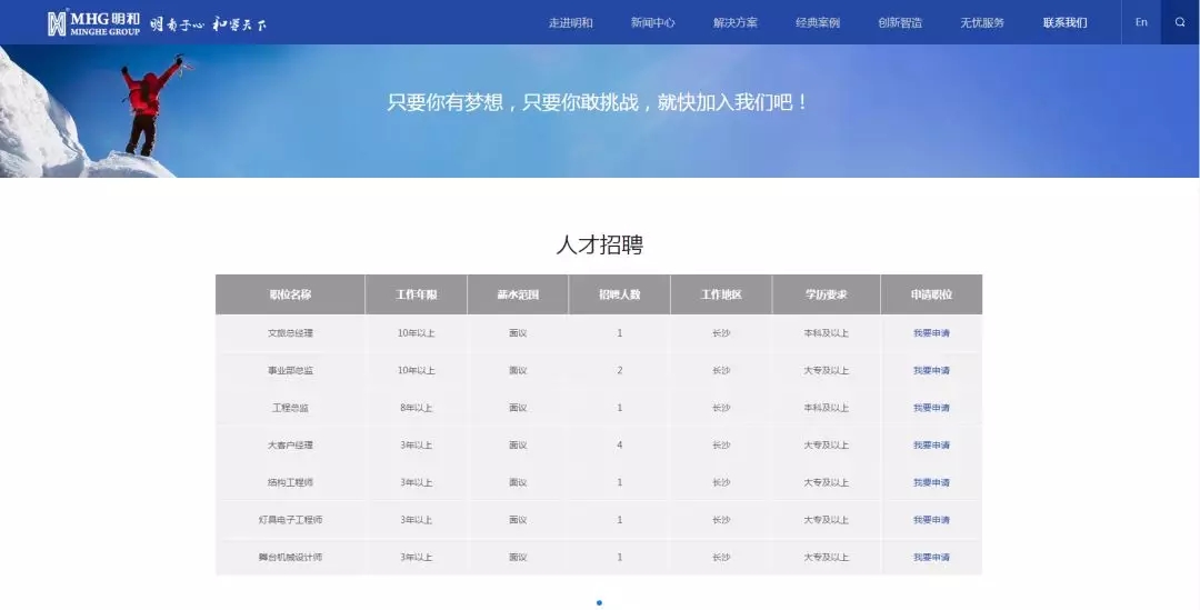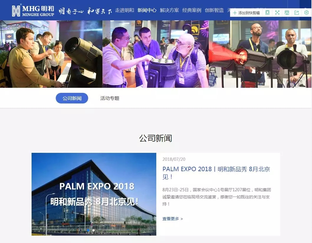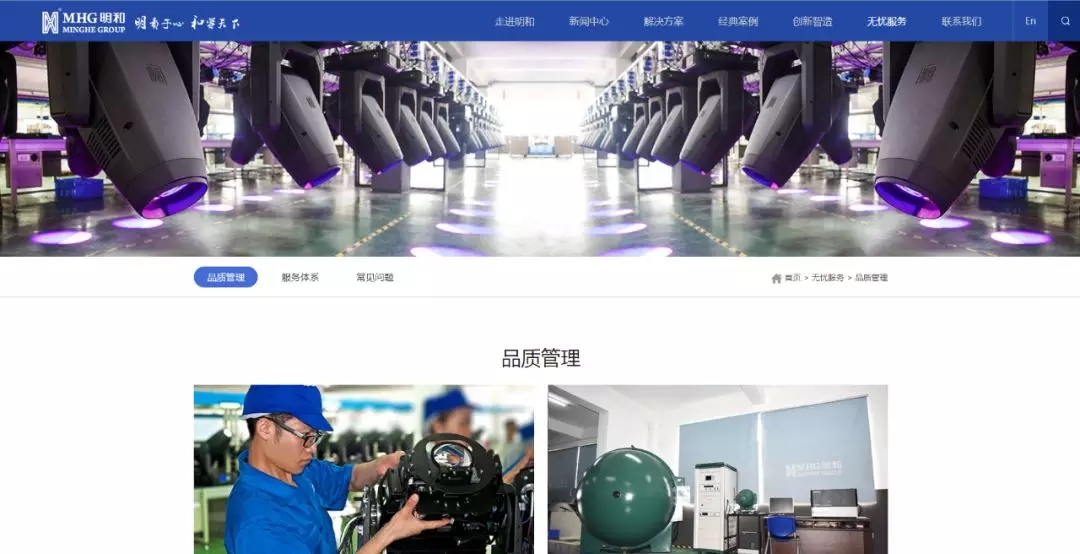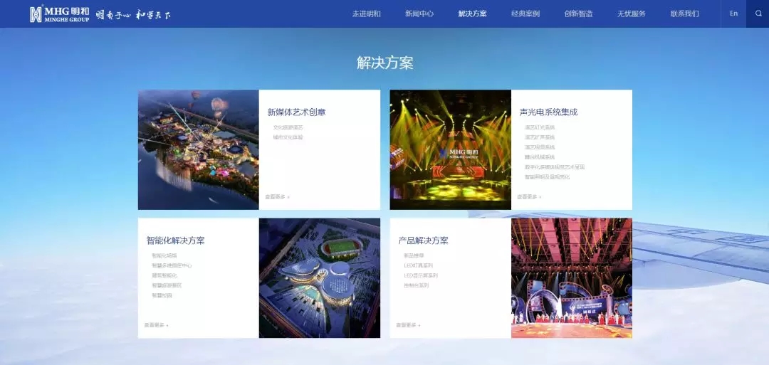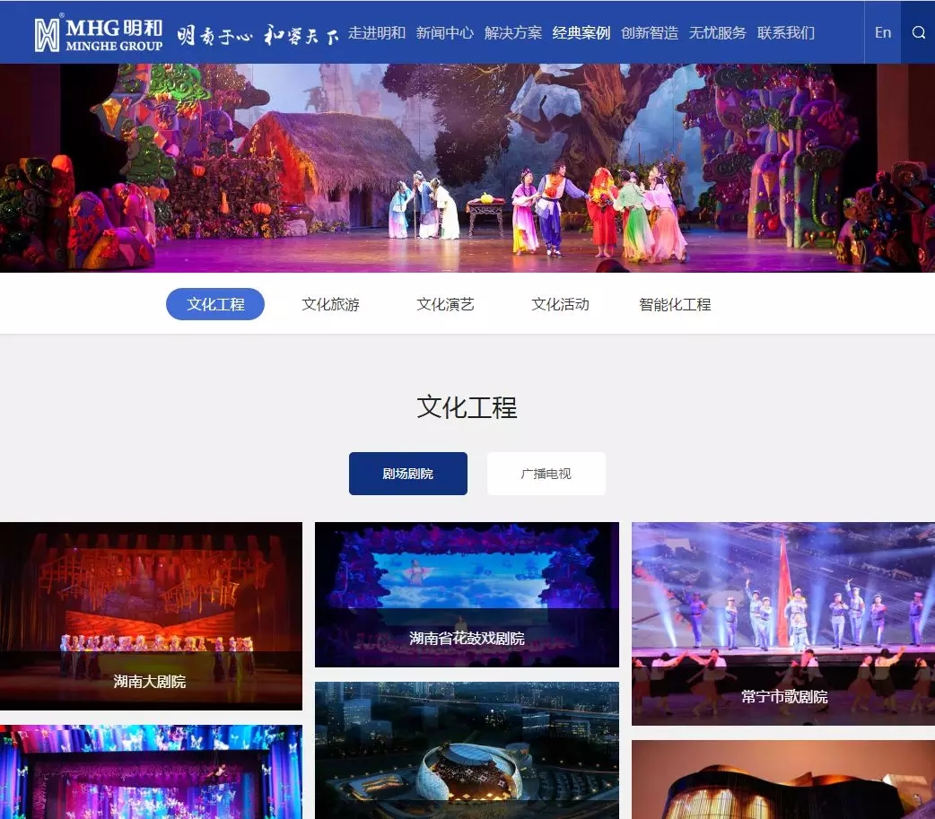 改版后的网站共分为“走进明和”、“新闻中心”、“解决方案”、“经典案例”、“创新智造”、“无忧服务”、“联系我们”7大版块,充分展现了公司以自身产品为依托,以科技创新为支撑,以文化创意为引领,将文化、科技 、艺术三者高度融合,打造文化产业综合服务平台的发展理念。