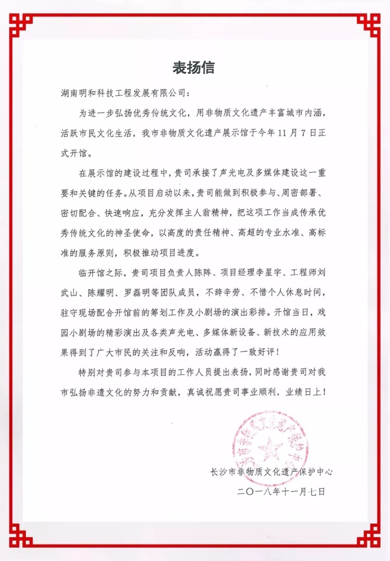 开馆活动结束后,湖南省文化和旅游局、长沙市委宣传部等领导对非遗馆项目建设工作给予了高度好评,长沙市非物质文化遗产保护中心特为明和发来表扬信,称赞明和以服务湖湘文化事业为己任 ,以高度的责任感及崇高的文化使命感,实现了非遗馆项目的完美呈现,对弘扬湖湘非遗文化提供了强有力的专业支持!