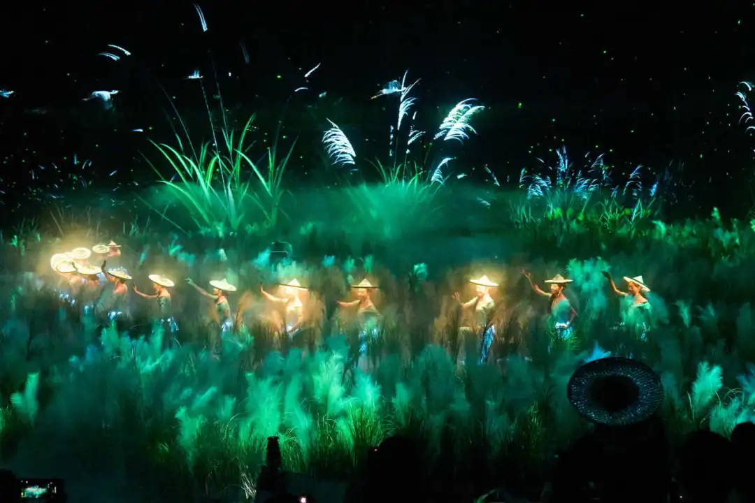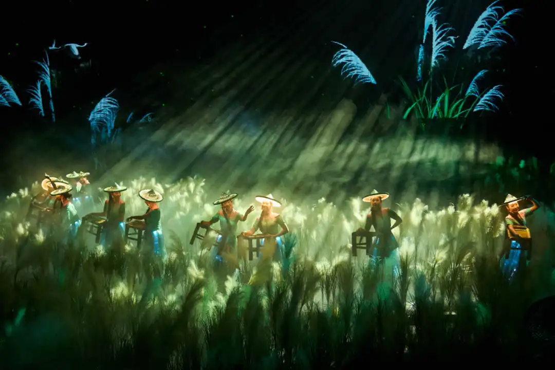 荷花村落,荷景剧场的光影莲池,在静谧中勾勒出 "荷塘月色" 的东方意境;芦苇房剧场还原的渔村生活场景,氤氲着人间烟火的温暖气息;水景剧场的明月倒影、候鸟翔集、江豚跃波、水帘光影,构筑成虚实相生的梦幻水世界;麋鹿剧场的斑斓丛林里,麋鹿与芦苇交织出湿地生态的蓬勃生命力。