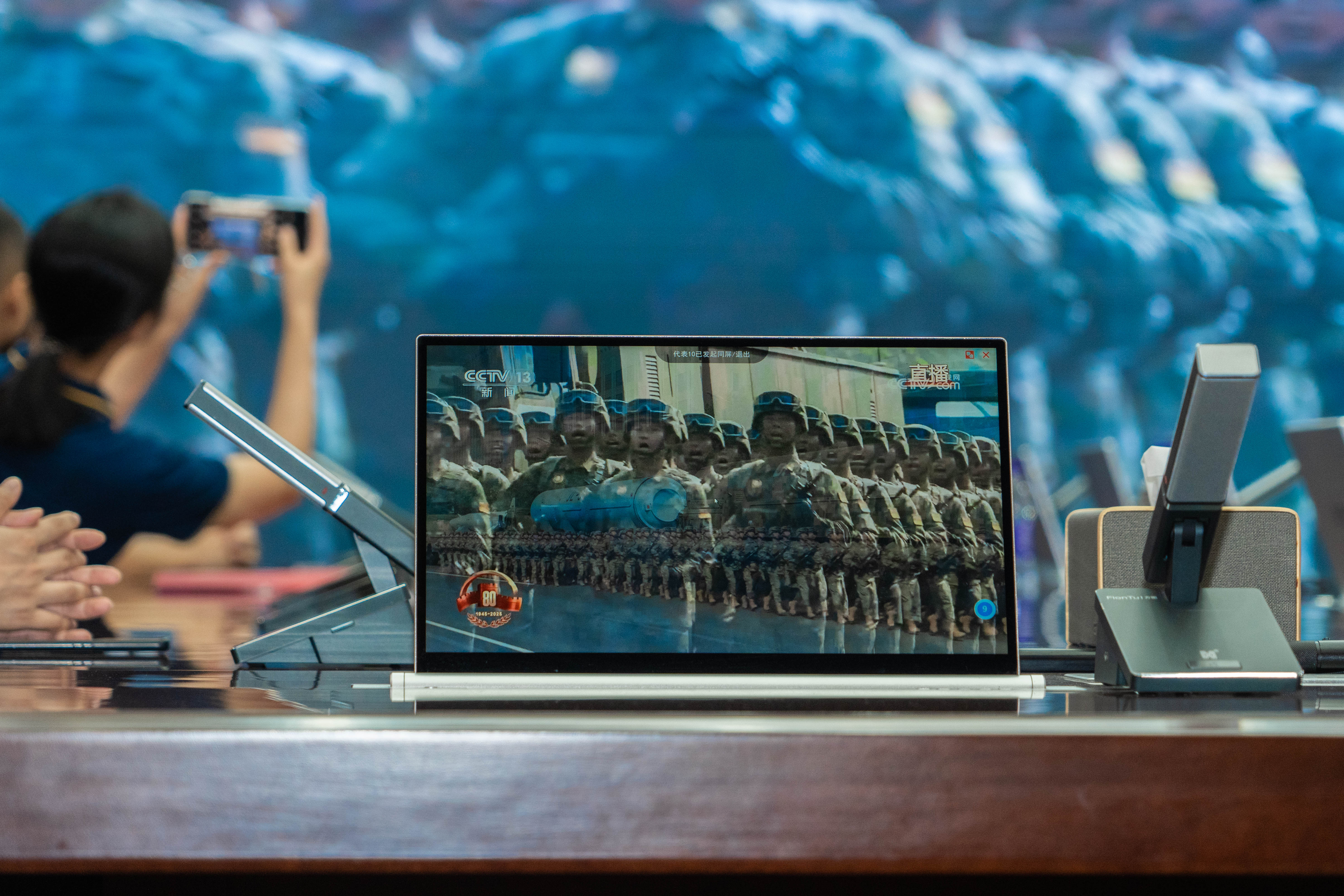 继升旗仪式后,公司党员干部及部分职工代表在明和智能化会议室观看中国人民抗日战争暨世界反法西斯战争胜利80周年阅兵仪式直播。