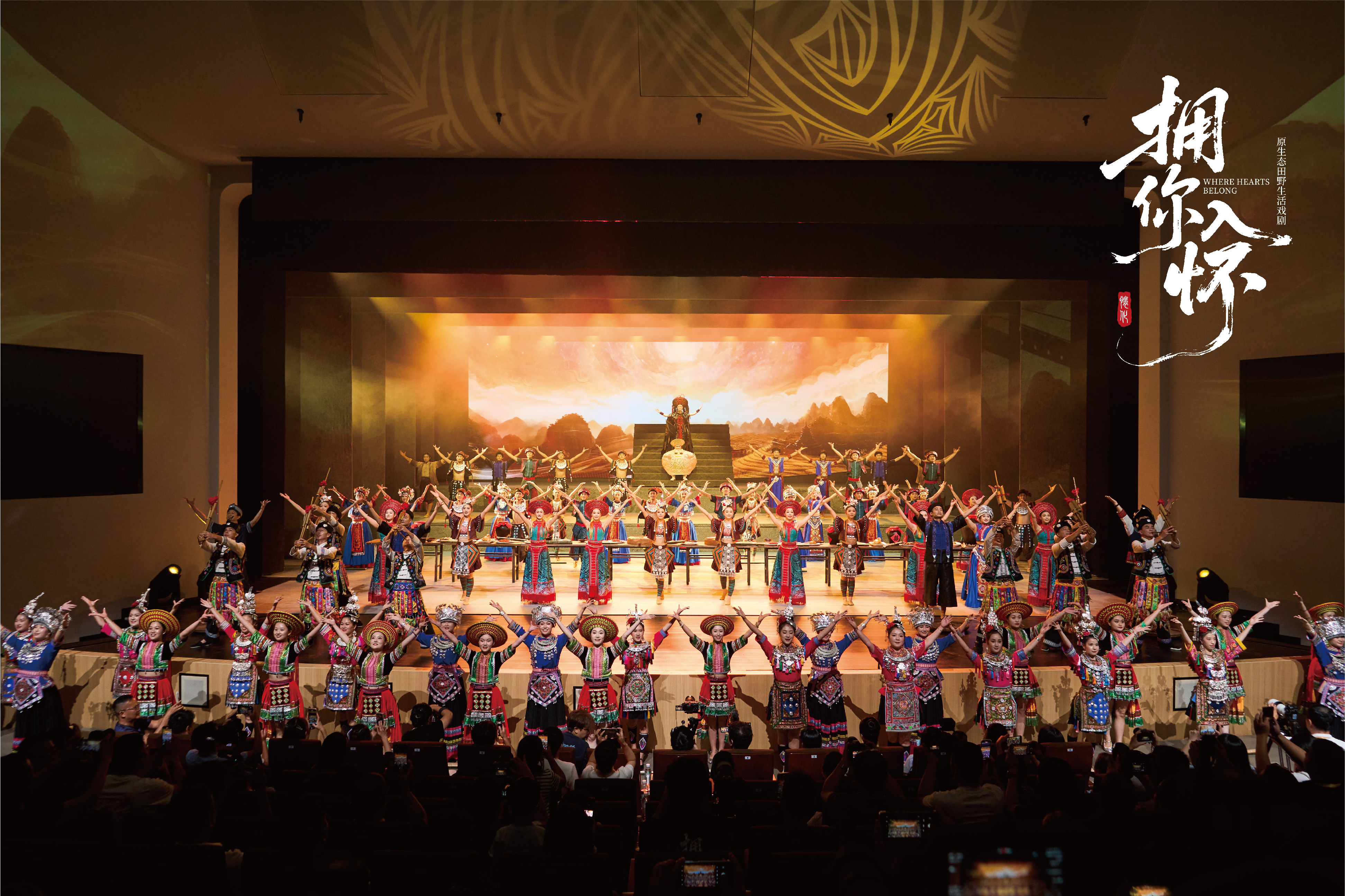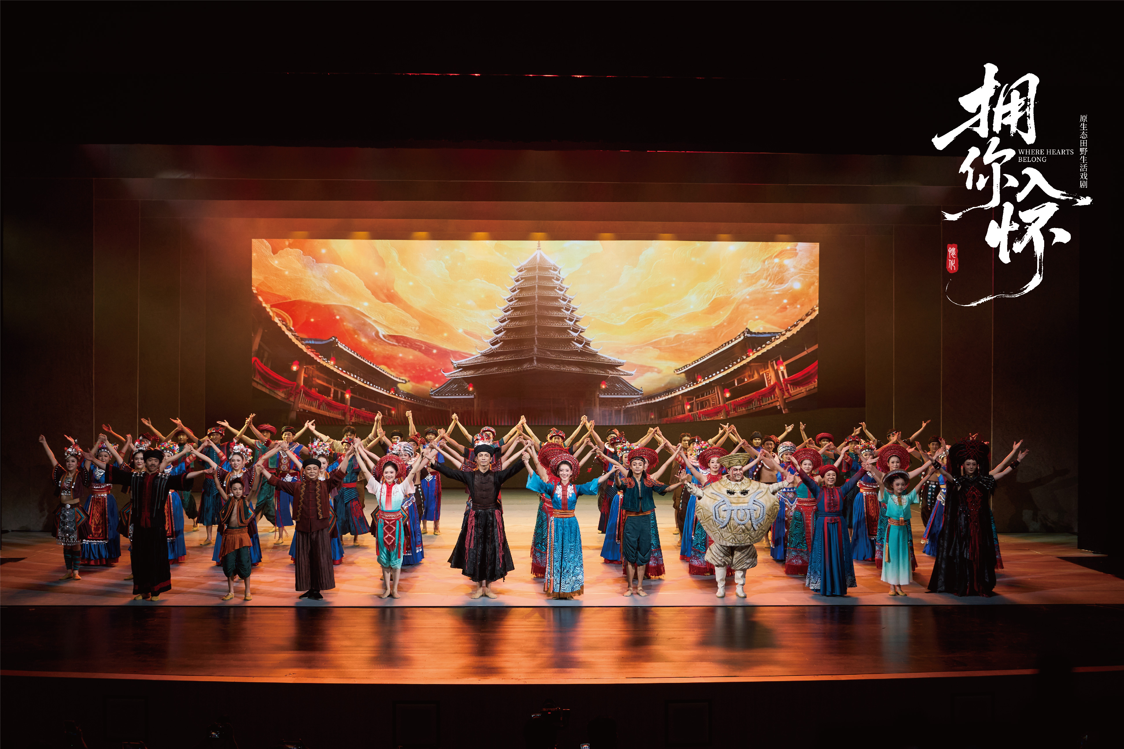 明和集团以“文化 + 科技”为手段,融合舞台机械、专业灯光、高清显示屏、全息投影等前沿科技,从技术设计到落地实施全程把控,将怀化的地域文化、民族风情与千年爱情故事鲜活呈现在舞台之上,打造出兼具东方美学与沉浸体验的文化盛宴。