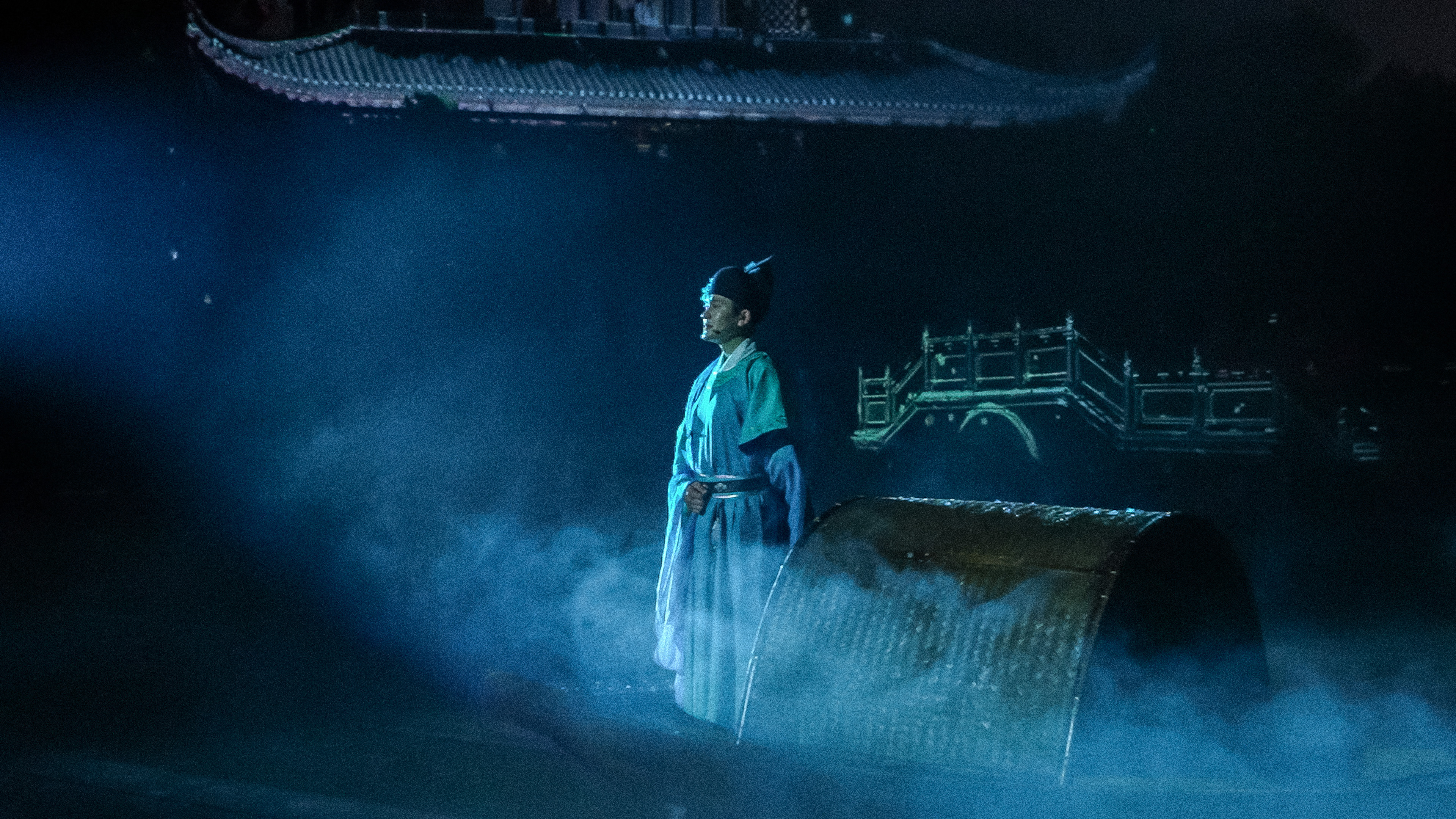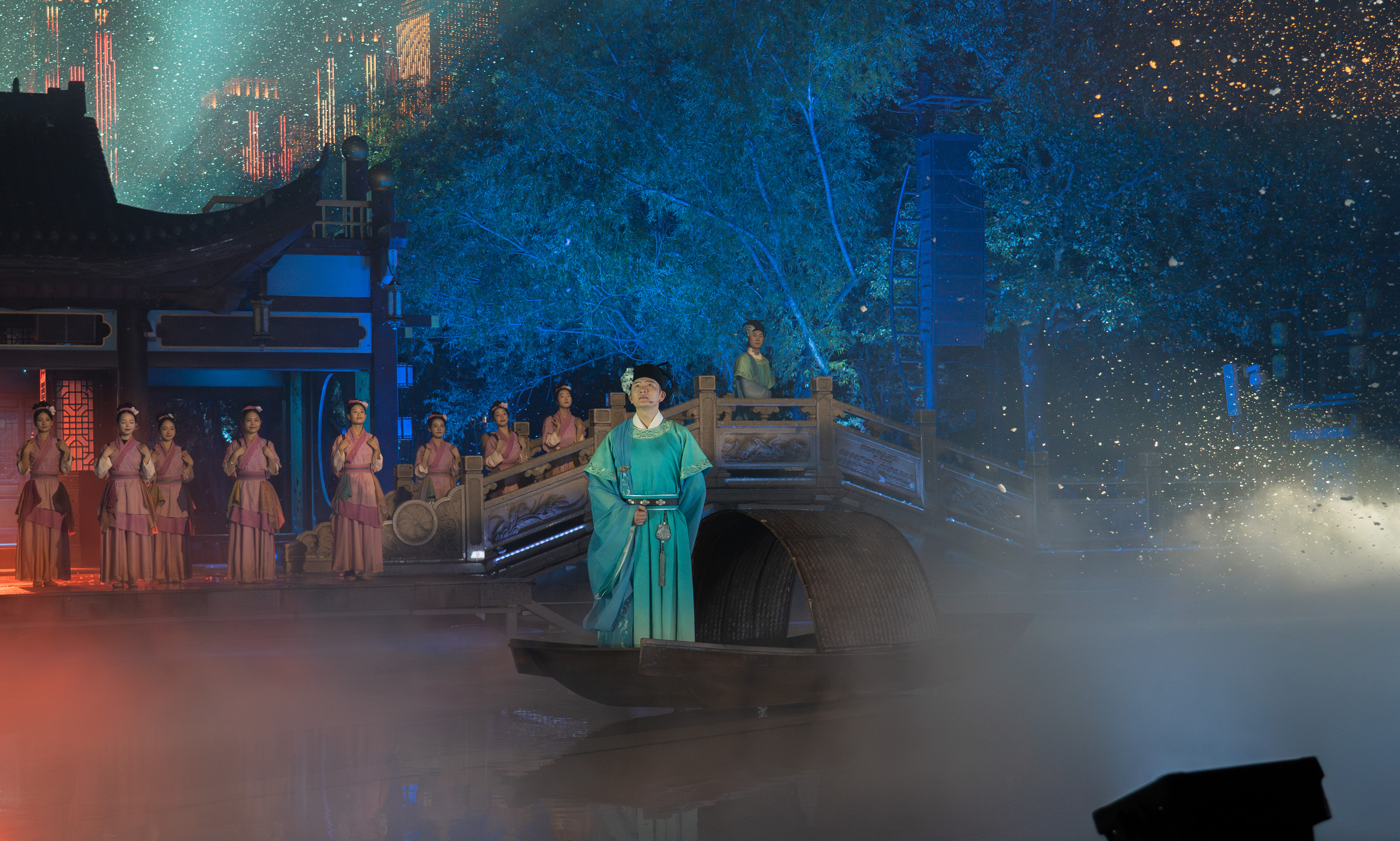 以北宋画家宋迪的“寻景之旅”为主线:剧中,宋迪在好友周敦颐的指引下,为探寻《潇湘八景》第八景的灵感遍历湖湘,于天地万象的壮阔与人间烟火的温暖中,细细体悟这片土地的深厚底蕴。明和集团以“文化 + 科技”为创新引擎,为该项目提供舞台机械从研发智造、技术设计到落地实施的全流程服务。