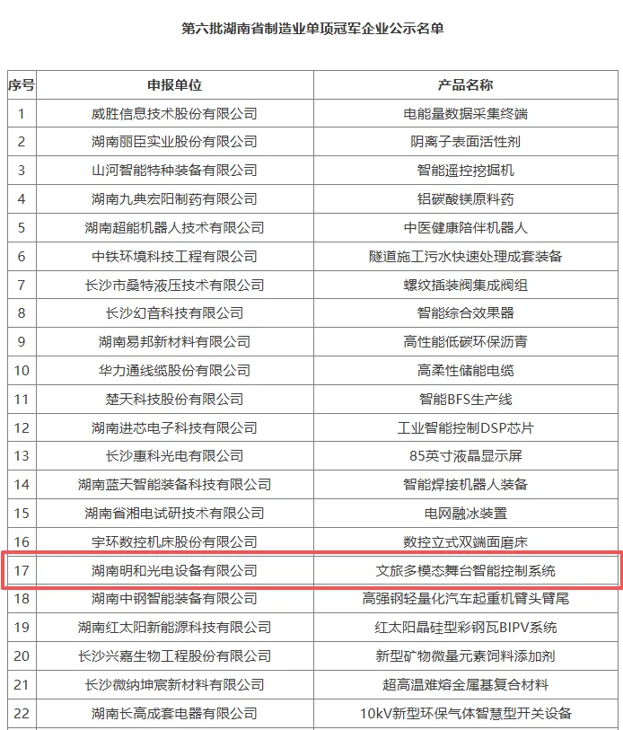 近日,湖南省工业和信息化厅公示了第六批湖南省制造业单项冠军企业名单,明和集团凭借自主研发的产品“文旅多模态舞台智能控制系统”荣登磅单,标志着明和集团在文旅行业的技术实力和市场地位获得了权威认可,也为科技赋能文旅产业高质量发展再添闪亮招牌。