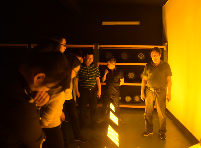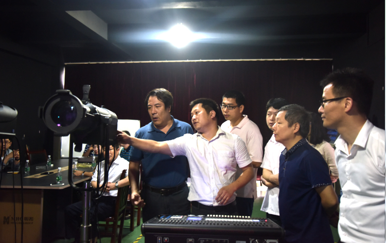 调研组现场观摩明和LED数字聚光灯、LED四合一摇头染色灯、324PR平板灯系列(7色、RGBW)、300CX成像灯系列产品的演示效果,并进行细节考察及测试。