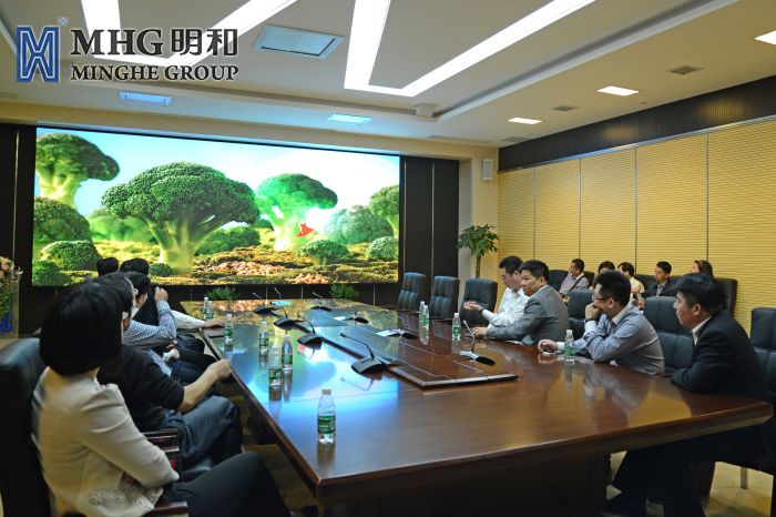 在明和多媒体会议室,明和专业技术人员向代表团领导逐一演示了高清显示系统、灯光系统、数字会议系统、智能控制系统、高清无线传输系统、扩声系统、建筑声学等系统的智能操作,并在会议室内通过先进的远程网络监控设备实时展示了生产制造中心各个车间的生产现场。