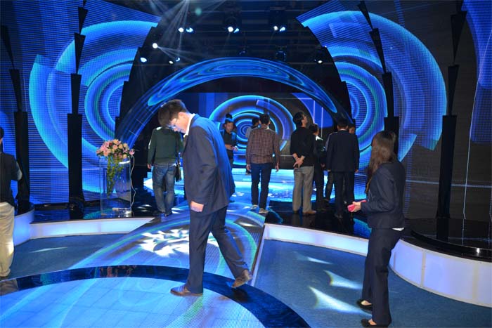 专家老师纷纷踏上舞台,仔细观看我公司的产品,并详细询问了产品的相关特性及优势,对极具创意的舞台设计及舞美效果赞不绝口。