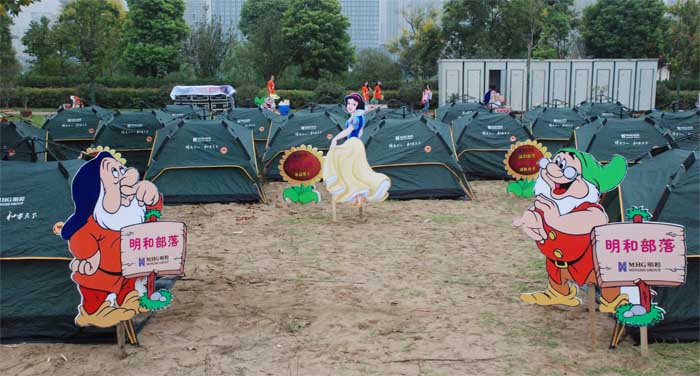 以七个小矮人与白雪公主的童话故事为主题的明和“部落”成为音乐节现场一道亮丽的风景线,高级野外露营帐篷排列成一个矩阵,煞是壮观。到了夜晚时分,明和专业灯具将帐篷区妆点得绚丽无比,演出了一场独特的灯光秀,吸引了众多观众前来观看,展现出国家文化产业示范基地的独特魅力与风采。